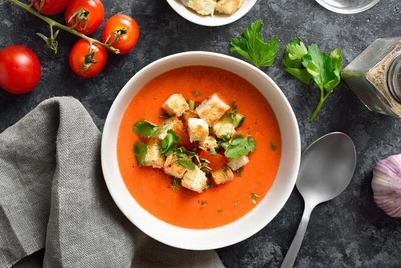 Enjoy cold gazpacho soup made with fresh tomatoes, cucumbers, peppers, and olive oil. A refreshing Spanish dish perfect for summer dining and healthy eating.